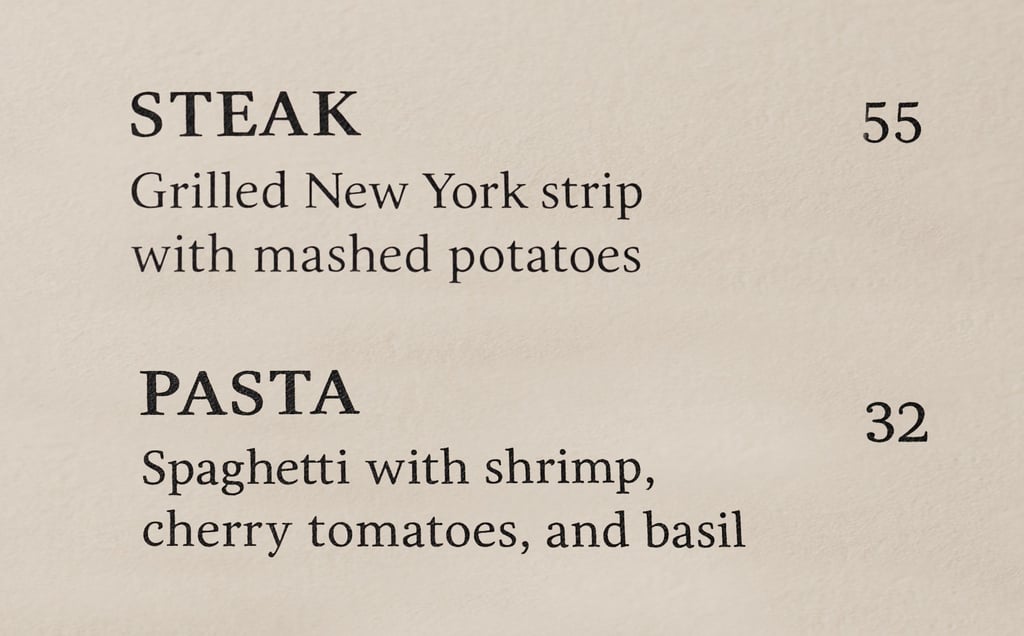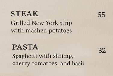 Example: A $55 steak sitting next to a $32 pasta, the pasta suddenly seems like a “deal.” This is known as anchoring, the higher-priced item makes others feel more reasonable by comparison.