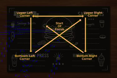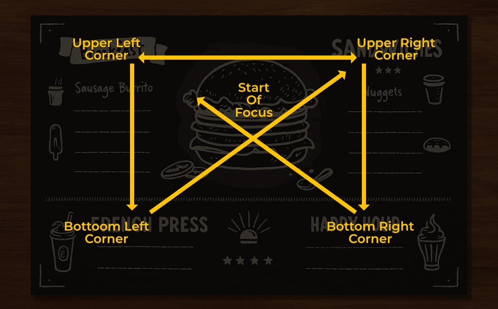 People don’t read menus like books. Studies show diners follow predictable visual patterns — like the Golden Triangle, where the eyes move from the center to the top-right, then top-left. Smart design places high-margin or signature dishes right where the eyes land first.